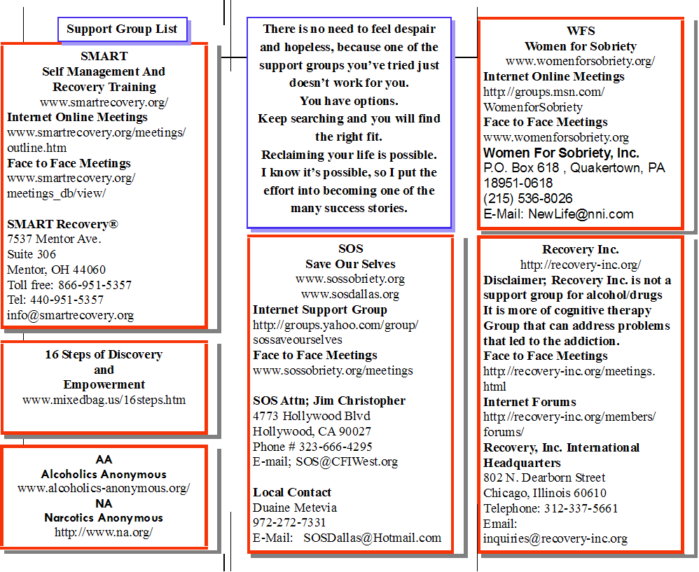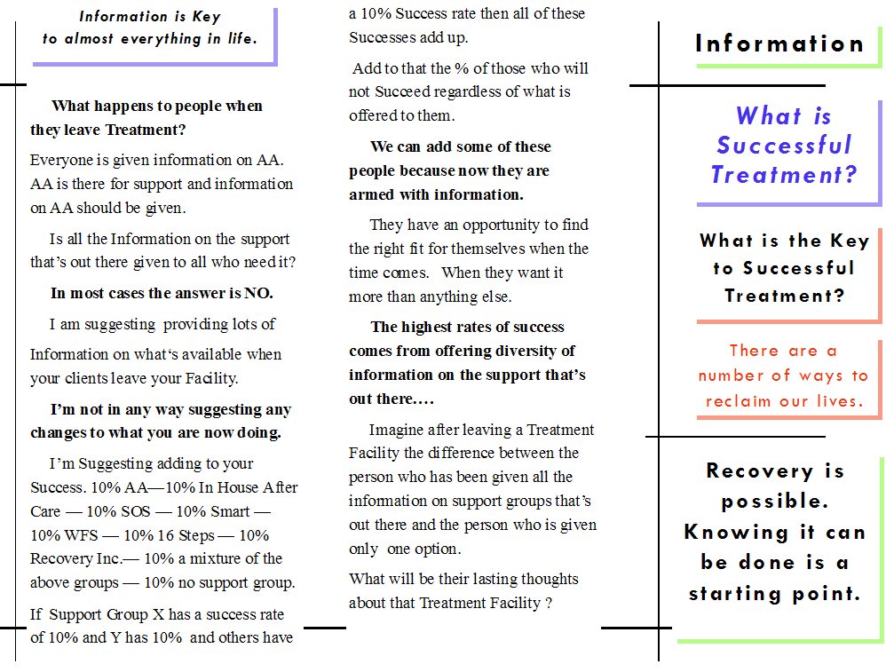 SOS Jail and Prison meetings.   It has information that can be used by almost anyone in SOS. I saw some very dedicated people working hard to make an SOS meeting work, and grow, only to have their efforts destroyed by others who had a different agenda. Because SOS is not a "Program" with hard guidelines, some saw this as an opening that they could drive a Mack Truck through. What's written in this book is not set in stone, but it is a very strong tool in taking back an SOS meeting or stopping it from being high jacked in the first place. Health Care Providers who want to have a working knowledge of SOS will benefit from this book. In-house recovery meetings held by Health Care Providers can include SOS meetings using "Building Recovery" as a guide. Jails and Prisons that want to hold an SOS meeting will benefit from this book. In Jails and Prisons that have "Building Recovery" the Inmates and the staff will be able to hold SOS meetings without reservation. No longer the fear that maybe they aren't doing it right. This book provides enough information that most people will feel confident holding an SOS meeting.  |